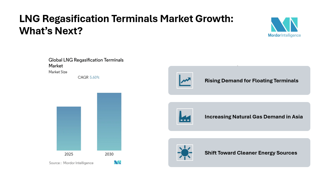The LNG regasification terminals market  plays a key role in the global natural gas supply chain, enabling liquefied natural gas (LNG) to be converted back into gaseous form for distribution and consumption. According to insights from Mordor Intelligence, the LNG regasification terminals market size is expected to expand steadily with a CAGR of 5.6% during the forecast period from 2025 to 2030, with 2026 considered a base year for analysis.