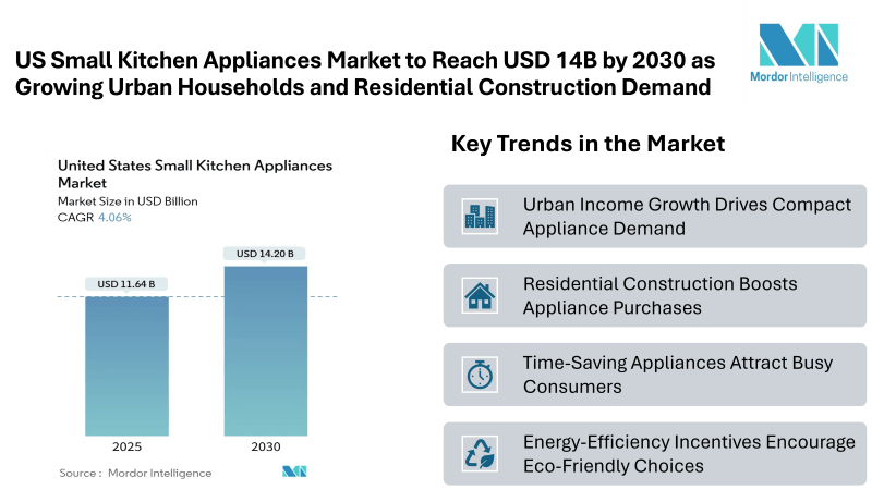 According to Mordor Intelligence, the US Small Kitchen Appliances Market size is valued at USD 11.64 billion in 2025 and is forecast to reach USD 14.20 billion by 2030 on a 4.06% CAGR.